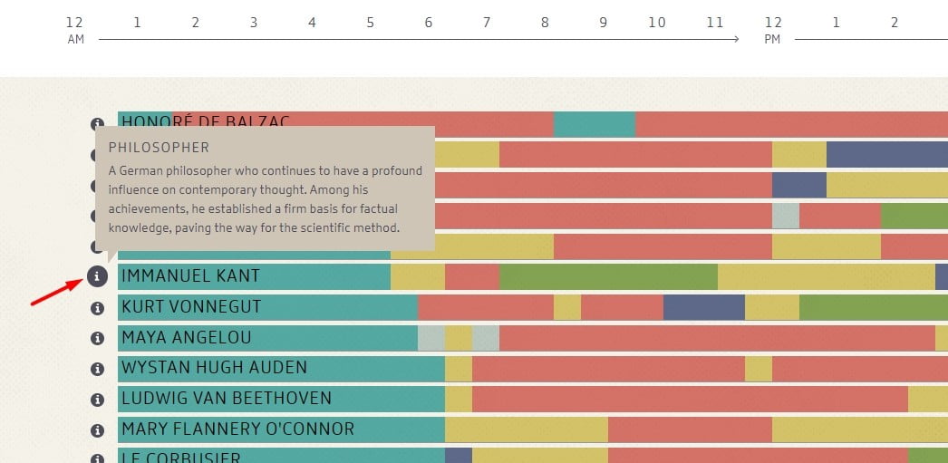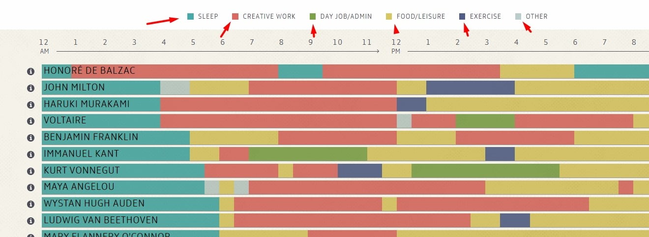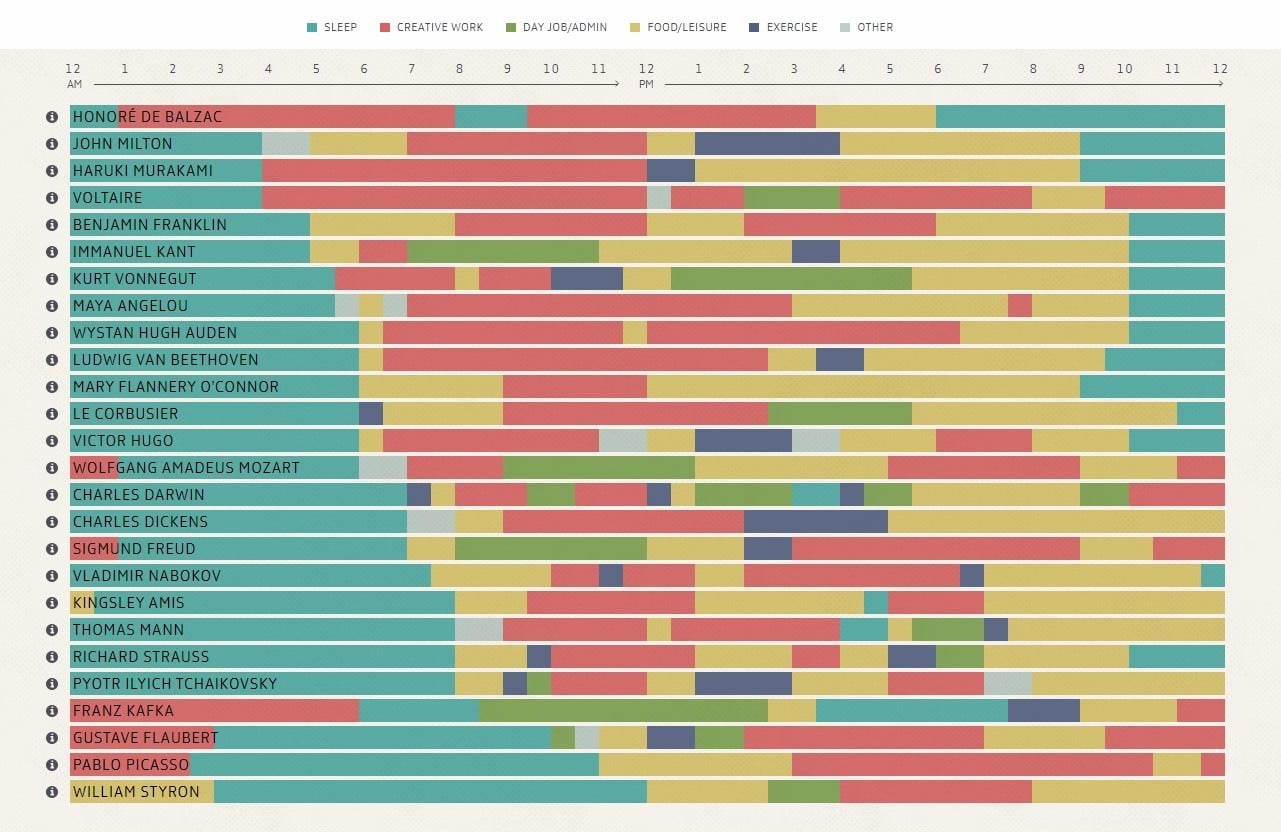 Знайшов цікаву таблицю, на якій відмічено коли й скільки спали й працювали видатні митці.